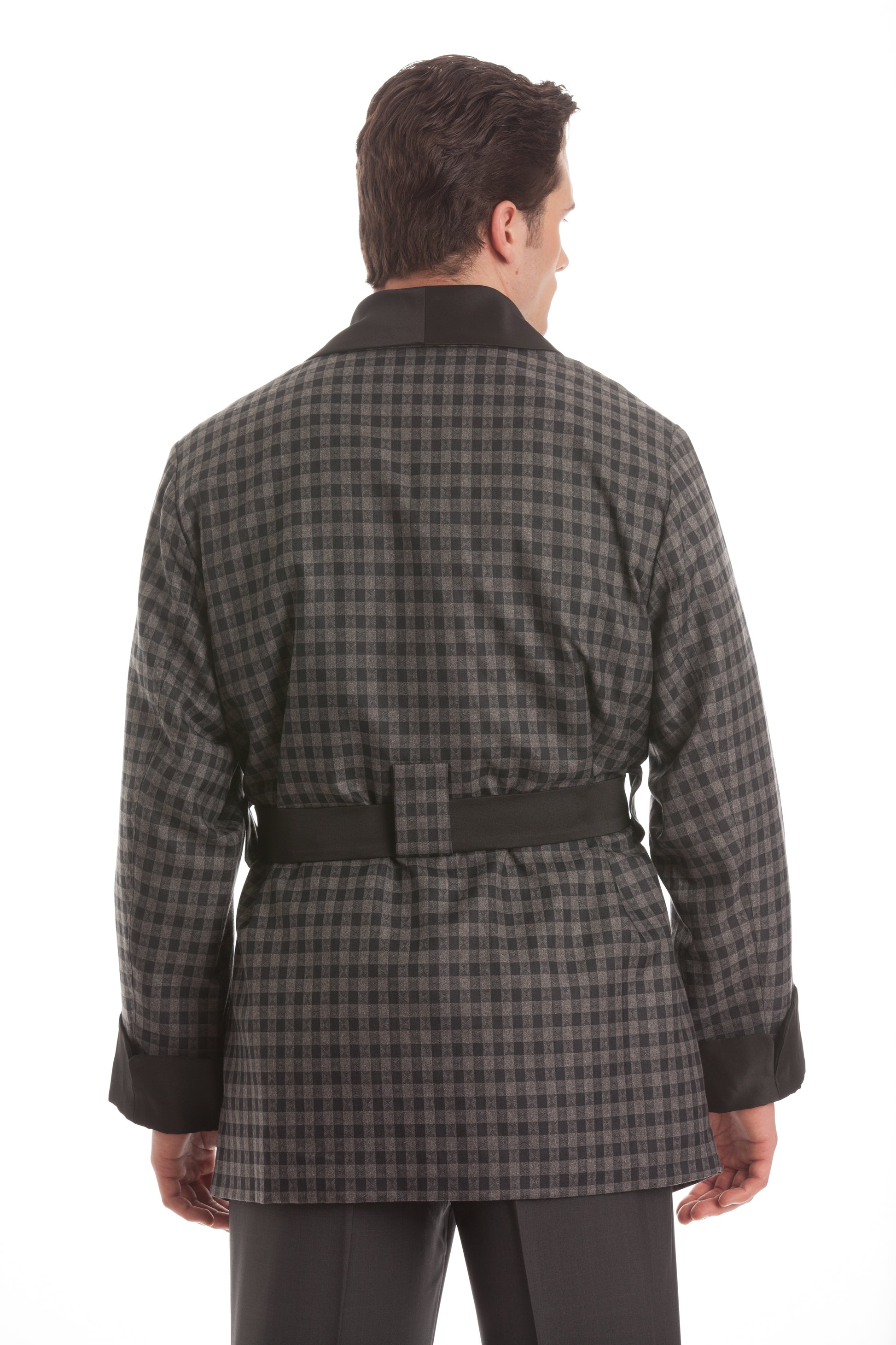 Satin Smoking Jacket - Gray Houndstooth with Black Collar