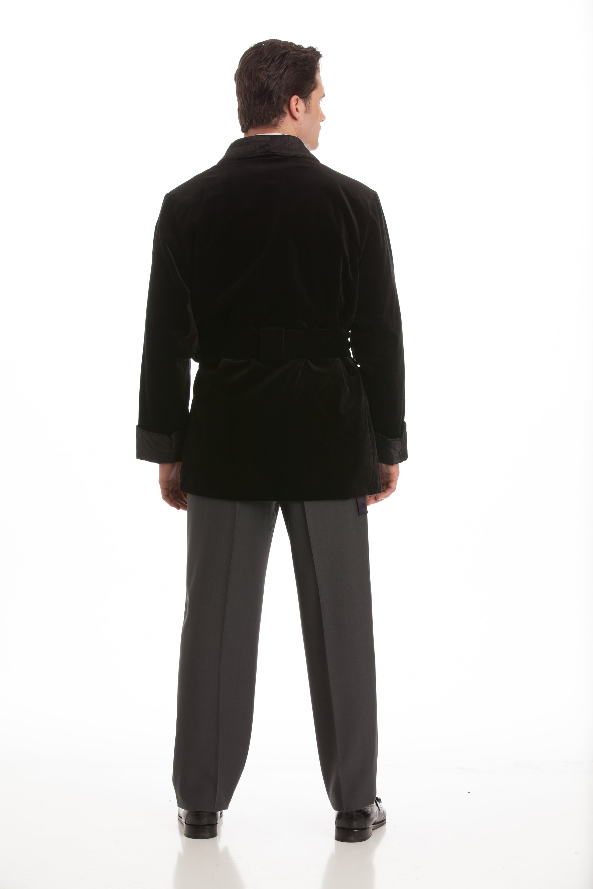 Classic Black velvet hip length Smoking Jacket made of 100% cotton. Quilted Black Quilted Collar and turn-up cuffs, have black twisted piping cord at edges. Three pockets are finished with burgundy satin bindings. Decorative tassels adorn the ends of the belt. The tie belt is held secure by buttons which can be attached to the belt loops. Jacket is fully lined with 100% satin. Simply perfect.