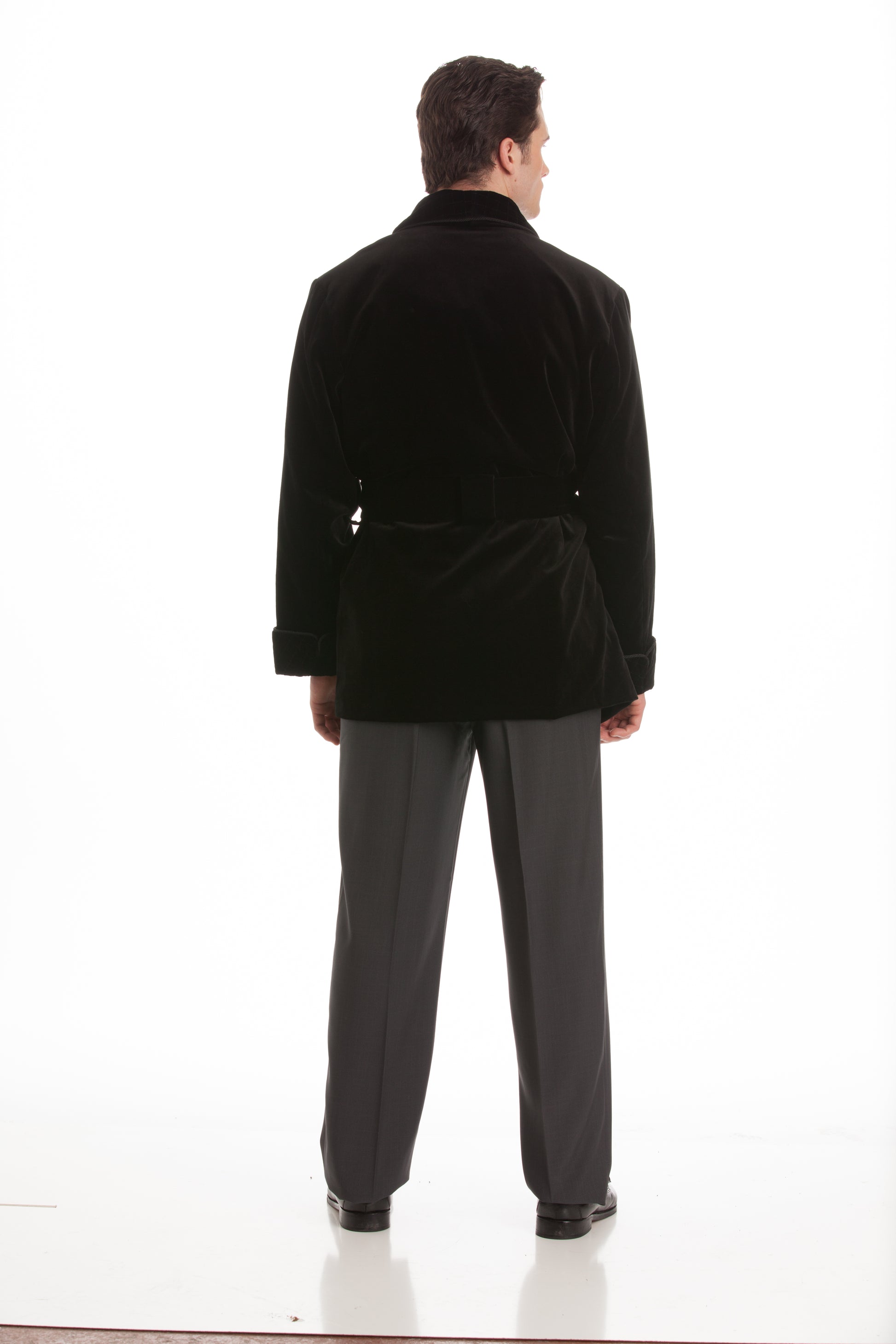 Classic plush black velvet hip length Smoking Jacket made of 100% cotton. Quilted black velvet shawl collar, have black twisted piping cord at edges. There are two deep pockets detailed with black twisted piping cord. The tie belt is held secure by buttons which can be attached to the belt loops. Jacket is fully lined with 100% silk. Perfect for hosting, smoking, lounging & all occasions.